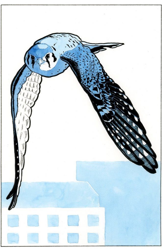 Barkman’s appreciation and mastery of his avian subject matter come across in every panel. His artistic approach to birds is generally quite realistic, with Life After Life’s three protagonists helpfully given distinguishing characteristics: Pips has bands on her legs put on by a scientist, Patches has white patches throughout her “cap,” and Fuzzie is—you guessed it—fuzzy. Other birds and wildlife are treated with equal thoughtfulness, with the aggressive blue jay in the opening scene (Nov. 1) and a majestic-yet-menacing merlin (Nov. 19) being two standouts.