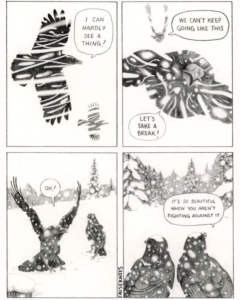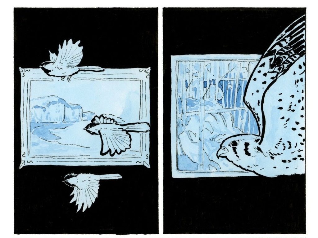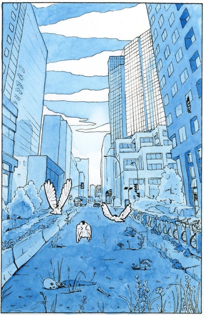 A story recalling “Coronavirus nature genre” headlines, Life After Life follows three talking black-capped chickadees named Pips, Patches, and Fuzzie as they adventure across post-apocalyptic Montréal in search of airplane peanuts. Like many of Barkman’s other Falsetober/Kneesvember efforts, Life After Life has a highly limited color palette, using only India ink and blue gouache on white paper. This palette intensifies the comic’s sense of serene melancholy. It’s hard to imagine a more stereotypically sad color than blue; a sad person may even be said to be feeling blue. But here blue isn’t just the color of “feeling blue”: blue is the color of vast expanses of water and sky. Blue is the color of attacking blue jays.