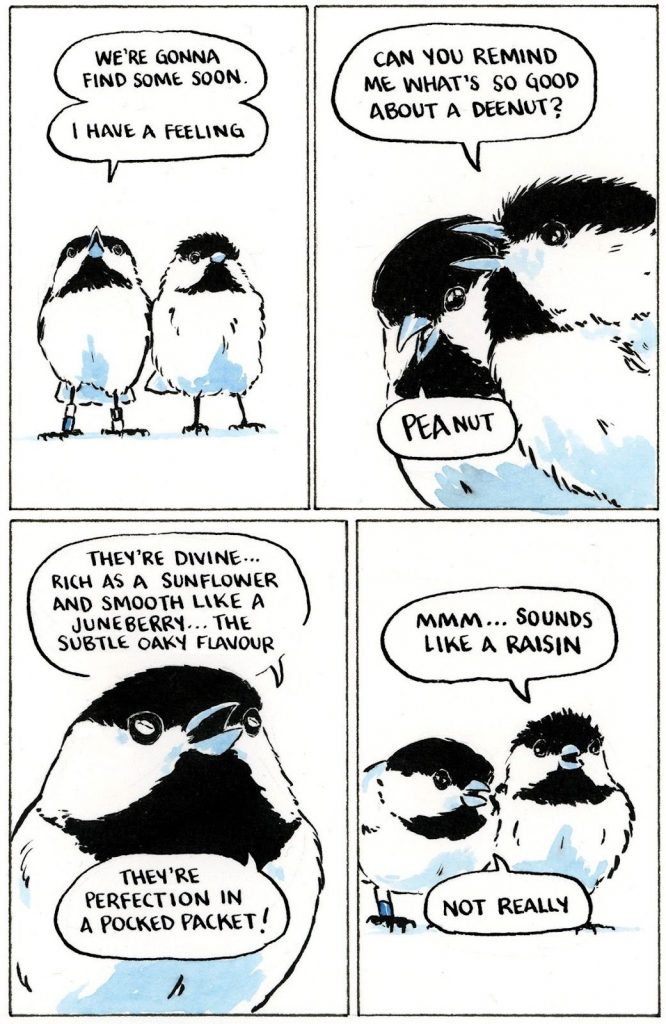 I must admit that the month I spent reading Life After Life and the months I’ve spent writing this review have also made me think not infrequently of my dad, himself an ecologist. This is somewhat ironic, as my dad tends to avoid climate fiction in his free time. Since my childhood, my dad has always stressed the importance of the natural world, our place in it, and learning as much about it as we can. Sometimes, that meant him quizzing me on tree identification at rest stops on road trips. In third grade, it meant helping me put together a tri-fold poster of photographs I’d taken and facts I’d compiled about the birds in my backyard. My dad likes to imagine that the things he plants now (his example is always an acorn, though he specializes in Indiana’s native plants) may be the very reason that species survive our extinction. I’m grateful to my dad for giving me this, as I’m grateful to Life After Life. While it may be a humorous comic about talking chickadees searching for “deenuts,” Barkman’s comic provides a vital reminder that our earth is precious and our time here is limited, so we must do the best with what time we have left.