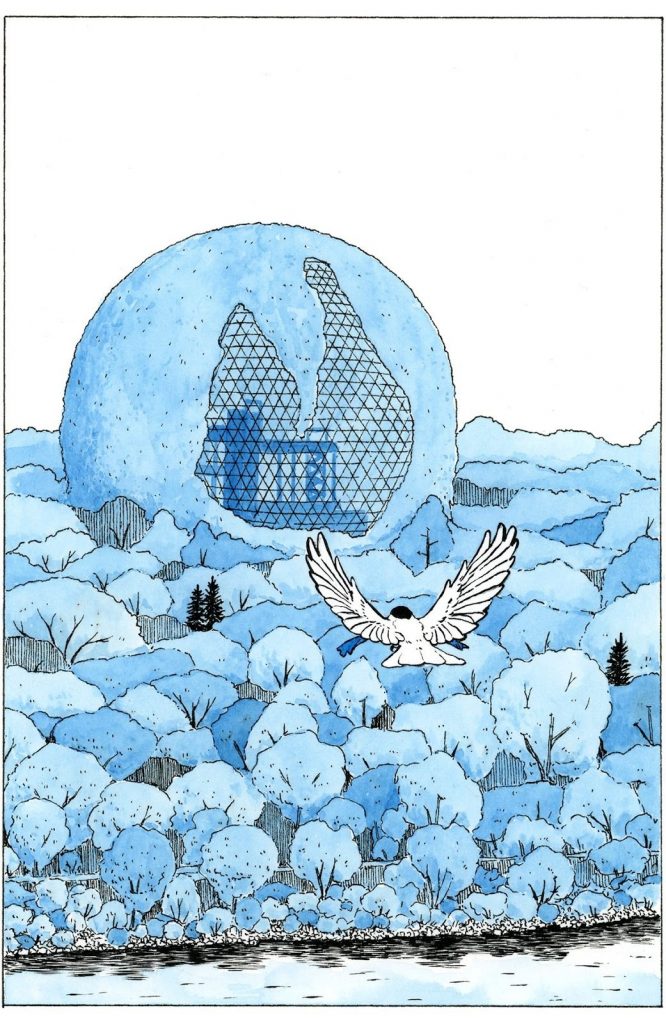 Life After Life is neither scathingly cynical nor profoundly hopeful in its pronouncement. In the comic’s landscape, spectres of industrialization like the abandoned Five Roses flour mill abound (Nov. 17), all since reclaimed by plant and animal life. Simultaneously, Barkman’s narrative stresses the ways in which humanity has loved and tried to protect the natural world. We see this both in a surreal scene where a merlin flies past landscape paintings in the now derelict Montréal Museum of Fine Arts (Nov. 21) and equally when Pips reflects on getting bands put on her legs by gentle conservationists (Nov. 11). In one of Life After Life’s most haunting moments, the chickadees soar towards the overgrown ruins of the Montréal Biosphere, an environmental museum that here feels akin to the ruins at Hiroshima Peace Memorial or Chernobyl (Nov. 9). A monument to ecological conservation, the message of the Biosphere ruins seems clear enough: the best thing we could do in the end was get out of the way. But then again, perhaps it’s works like the Biosphere that allow plants and animals to thrive after us in the first place.