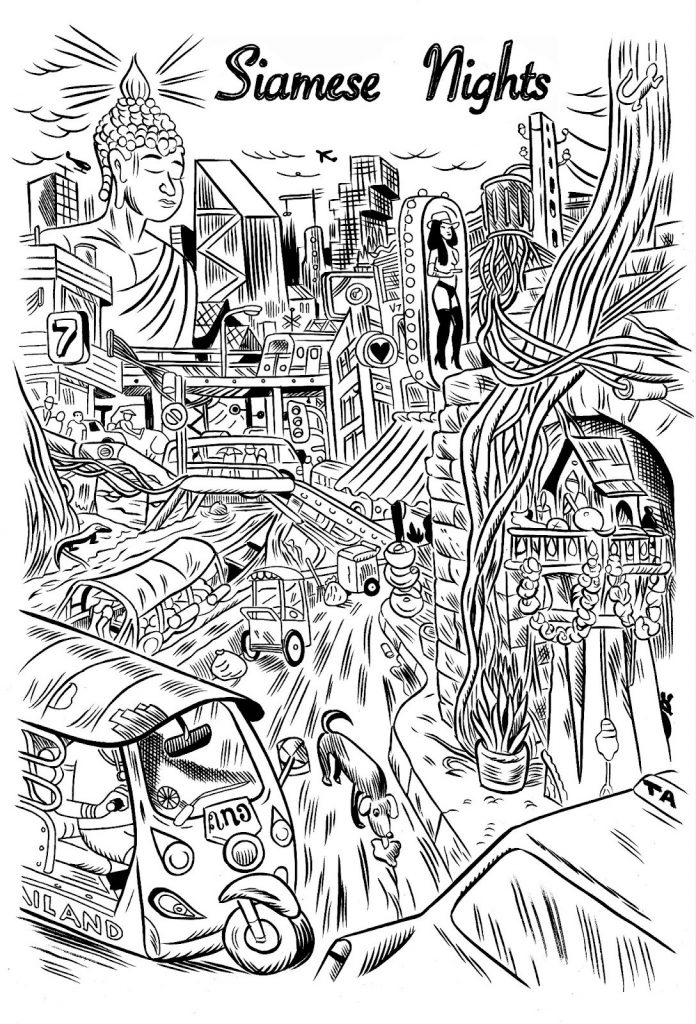 The super fun thing I did, I enlisted my friend Mats Stromberg to draw the frontispiece to the story, a sort of overview illustration of Bangkok. Mats has spent time in Thailand and Burma; he’s the perfect guy to draw this page. He is a world class cartoonist and painter. In a subtle way, it sets up the idea that Boyd sketched the frontispiece, as it looks different from my drawings!