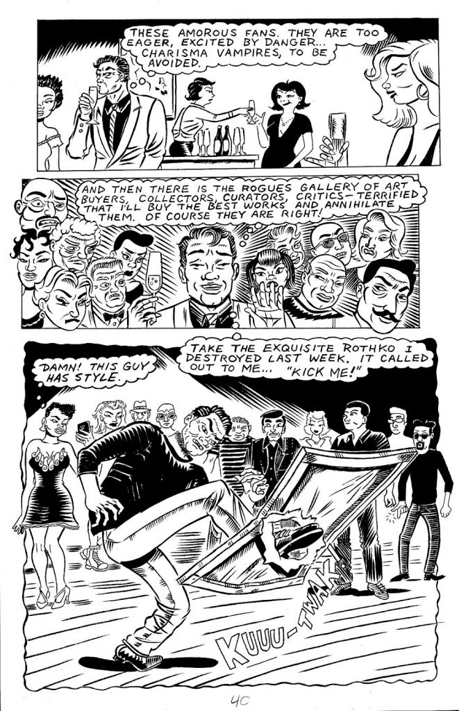 SL – I really immersed myself in drawing the destruction of the art! It was a new kinda kick. Personally, I love Mark Rothko’s paintings. I would not kick a hole in one of his canvases. But it was fun to draw Minor Watt doing the same.