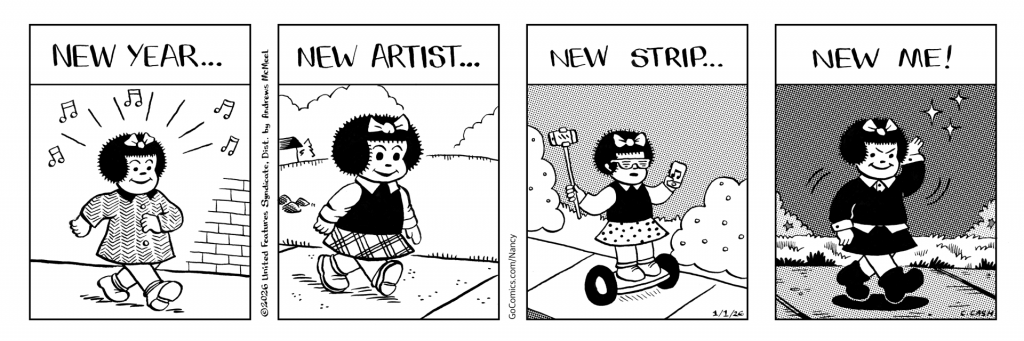 2025 was a fructuous year for Cash: In August, Oni Press published her licensed Adventure Time book, The Bubbline College Special; and in September, Andrews McMeel Syndication announced that she would be the new cartoonist for the Nancy comic. Cash had been a guest artist for three weeks in 2024, but as of January 2026, the legendary strip is all hers.