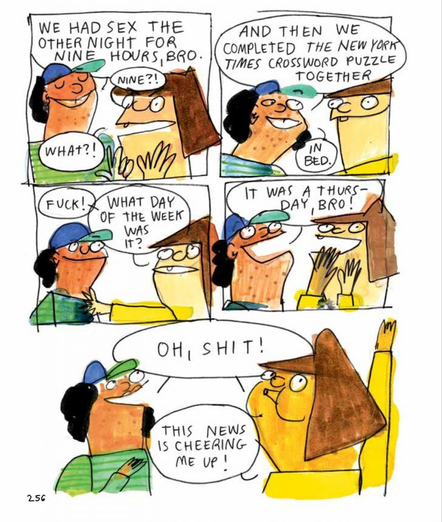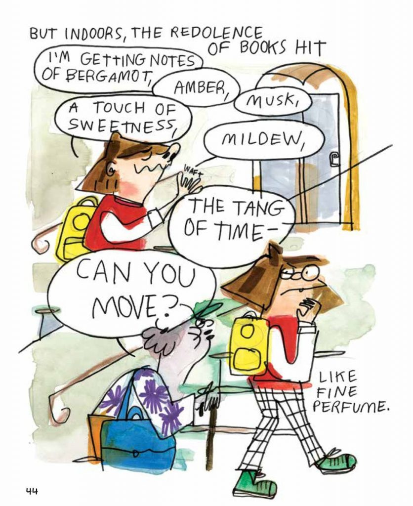 Well, I actually edit comics myself too, so I would say it’s a combination of the basic literary editing, where you’re looking at the words, you’re talking about the sentence flows, you’re talking about grammar, and continuity and style and all of that stuff, but then you kind of add those same elements to looking at the images. I think, I’ve worked with a lot of editors before where I pitched comics to outlets that don’t edit comics, and a lot of times, people don’t look at the pictures, or I think they feel, since you’ve already drawn and painted the whole page, they don’t want to give you edits because it would mean changing things, but I always have no problem changing the images as needed. I had an editor once at Hyperallergic, which is this art website, and I was doing these illustrated reviews of art shows, and she was really cool. Her name is Jillian Steinhauer, and she’s now doing reviews for The New York Times and stuff, but she was one of the first editors I had that actually paid attention to the pictures, too. So she noticed in one part I had mentioned this dress in an exhibit that had sequins on it, and her note was this dress doesn’t have sequins on it. They do so much. I felt like people hadn’t necessarily paid attention to that. Drawn and Quarterly, they’re complete pros. So they definitely knew about that dance that you achieve between words and pictures. I think it’s sort of dividing your attention between those two elements, but also having an eye for how they flow together. Sometimes I would draw something and it would be confusing, or I would draw something that I had already written, so either I could delete the text or remove the picture, you know, because those are sort of redundant, so there’s all these little things to look out for.
