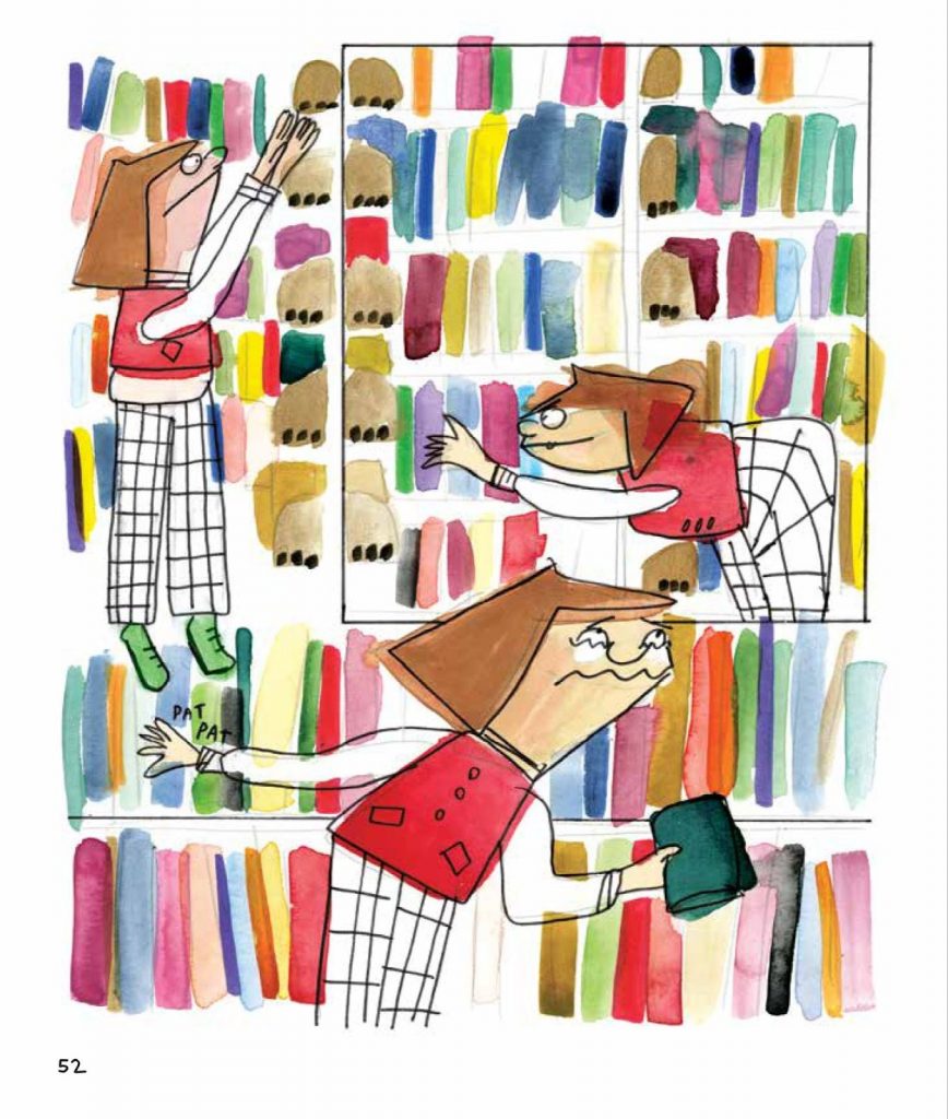 Yeah, totally. So I was into The Berenstain Bears and there’s this one storyline in The Berenstain Bears where the brother and sister have to clean their room; it’s a huge mess and they do it, but the drawings are first of the messy room which I just love, the interior landscape, a kitchen, or a faucet or a bedroom, and then they get all these tupperware containers and they label them, and then they show the room clean, and so I was obsessed with those drawings, I loved seeing the room go from messy to clean in drawings. There’s this book called Gregory The Terrible Eater, which is about a goat who eats a bunch of trash, and so there’s piles and piles of garbage in it. So there’s a scene in Checked Out where Louise flushes herself down a toilet, and she’s, like, swimming through the sewer and there’s all this trash around. So I consulted that one because I was like, okay, apple core, tin can, more trash. I definitely looked to Gregory The Terrible Eater. But I think in terms of worldbuilding, children’s illustrators are just so good at that. I mean, I’m dying to break into children’s book illustration, I just don’t know the secret handshake or how to do that. That’s kind of a goal of mine.