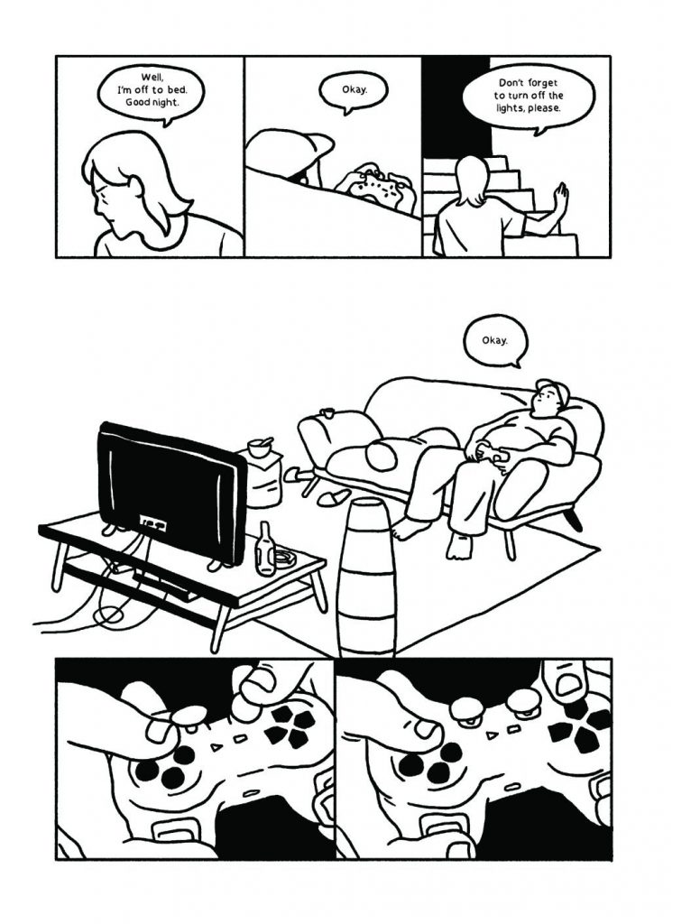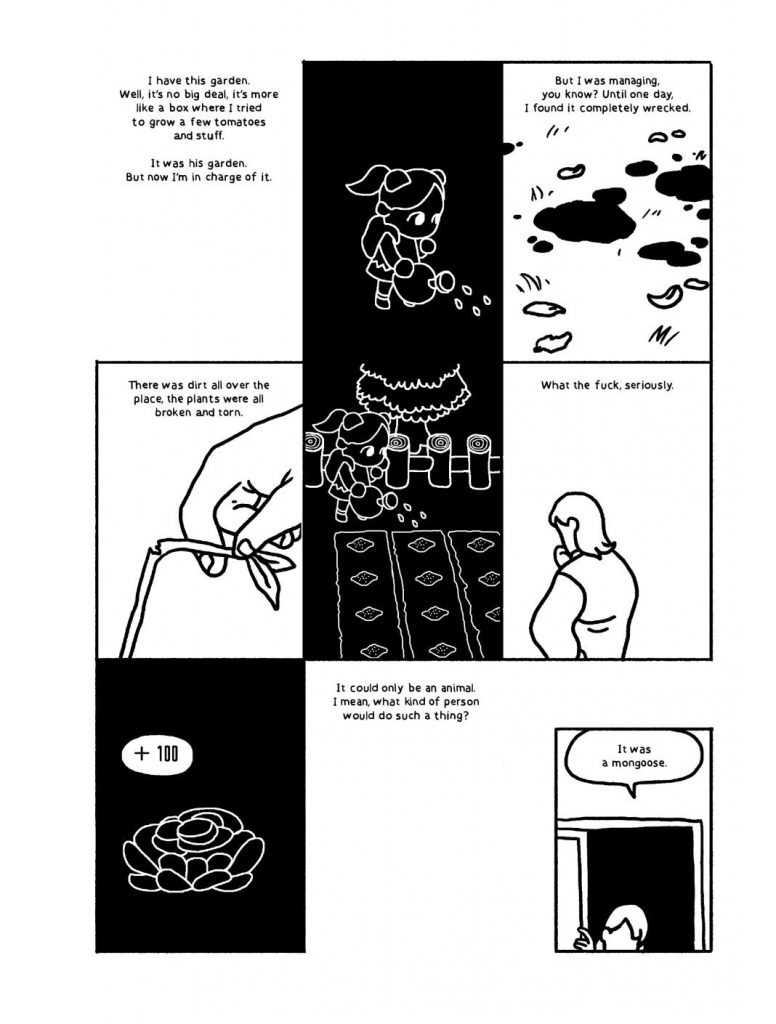 Their mother tries to help Júlia, but, as is often the case with family members, her attempts seem to do more harm than good. Given the mother’s affect, it’s understandable why. Rather than clearly hearing and understanding her daughter, she bulldozes through whatever Júlia says, believing she knows what’s best for her daughter. A small example is when she comes over for lunch, and she brings groceries, including bread. Júlia told her on the phone that she already had bread and, thus, didn’t need any. Leading up to the lunch, Mosi has two parallel sets of panels, one of Júlia running, while feeling like a mongoose is following her, a clear representation of how she feels stalked by grief, and the other of Júlia’s talking about her mother. Then, when her mother arrives, she speaks almost nonstop, moving from advice to chastisement: “You can freeze it [the extra bread]. It’s important to eat properly. Have you noticed those dark circles under your eyes? I’ll make lunch. You have to get your vitamins and nutrients and anti-oxidants. And fibre. Fibre is very important.” Not surprisingly, Júlia spends much of the work trying to avoid her mother, though it’s clear to the reader that her mother does actually care; she just doesn’t know how to deal with her daughter’s grief.