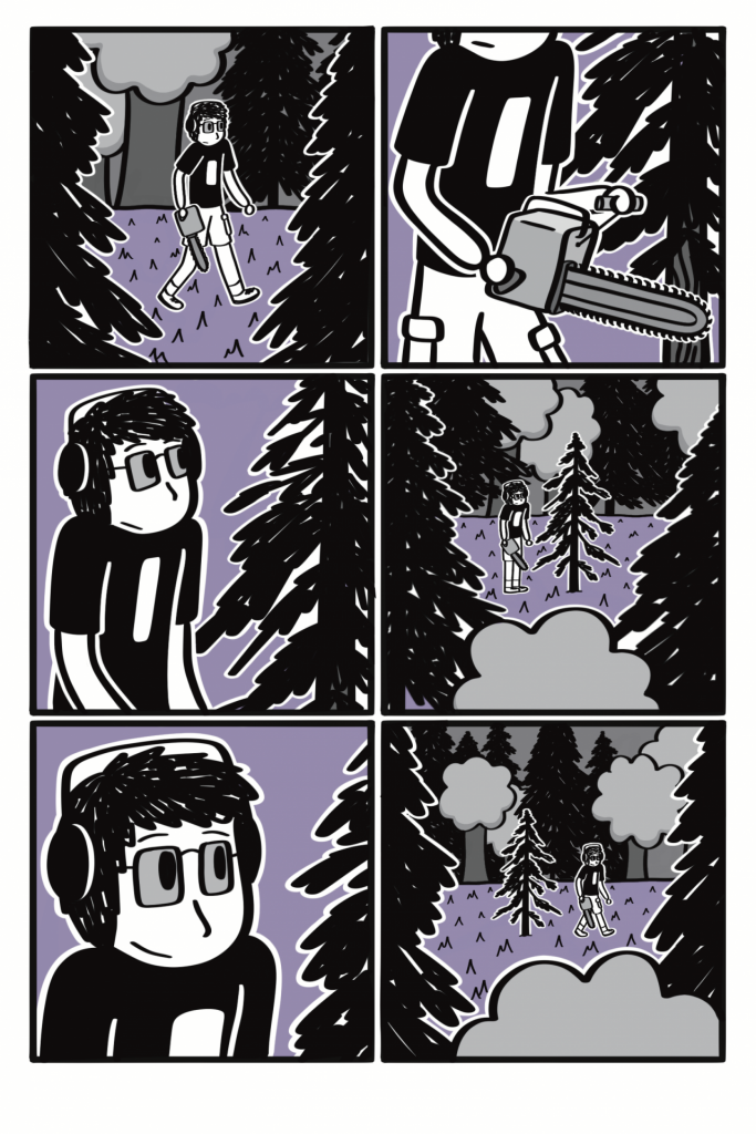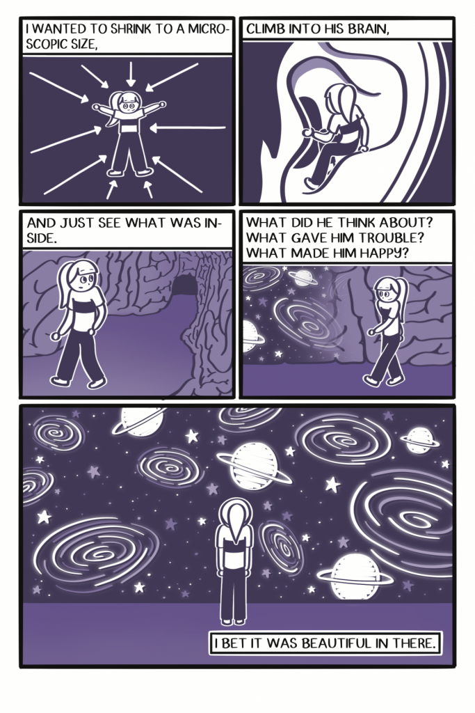 In Love is Strange, Cooklin navigates the realization that she is asexual, meaning she can still experience love but does not desire any sexual intimacy from others. She provides interiority by showing us a glimpse into her search history and her diary, where she writes “I don’t think I understand sex. Like at all. I don’t understand why everyone is so obsessed with it.” By discovering her identity, she accepts herself as she is and embraces love as a possibility for herself on her own terms. There’s a beautiful single panel drawing of her and her lover surrounded by a gray scale outer space that perfectly encapsulates the feeling of being isolated from others due to how she feels while being super connected to the one she does feel love for.