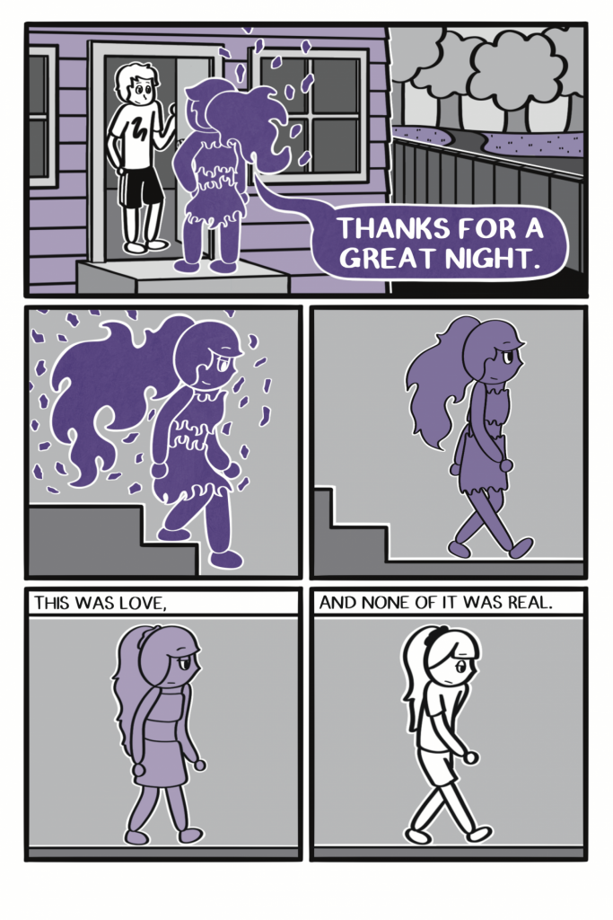 In part five, Love is Obsession, Cooklin plays with her color palette in scenes where sex is a part of the conversation by dimming the purple into a gray. In other areas, however, gray also seems to represent freedom and liberation, while the pages darken to heavier shades and eventually black in scenes where Cooklin questions her agency and willingness to participate in society’s definition of what love is. After she has sex, her avatar is drawn purple and falling to pieces, perhaps a representation of how the protagonist doesn’t feel whole. She seems corporeal. On the last page of the section, backgrounds fade to gray. Cooklin walks down the stairs of the page, purple and then white, the caption telling us “This was love. . . And none of it was real.”