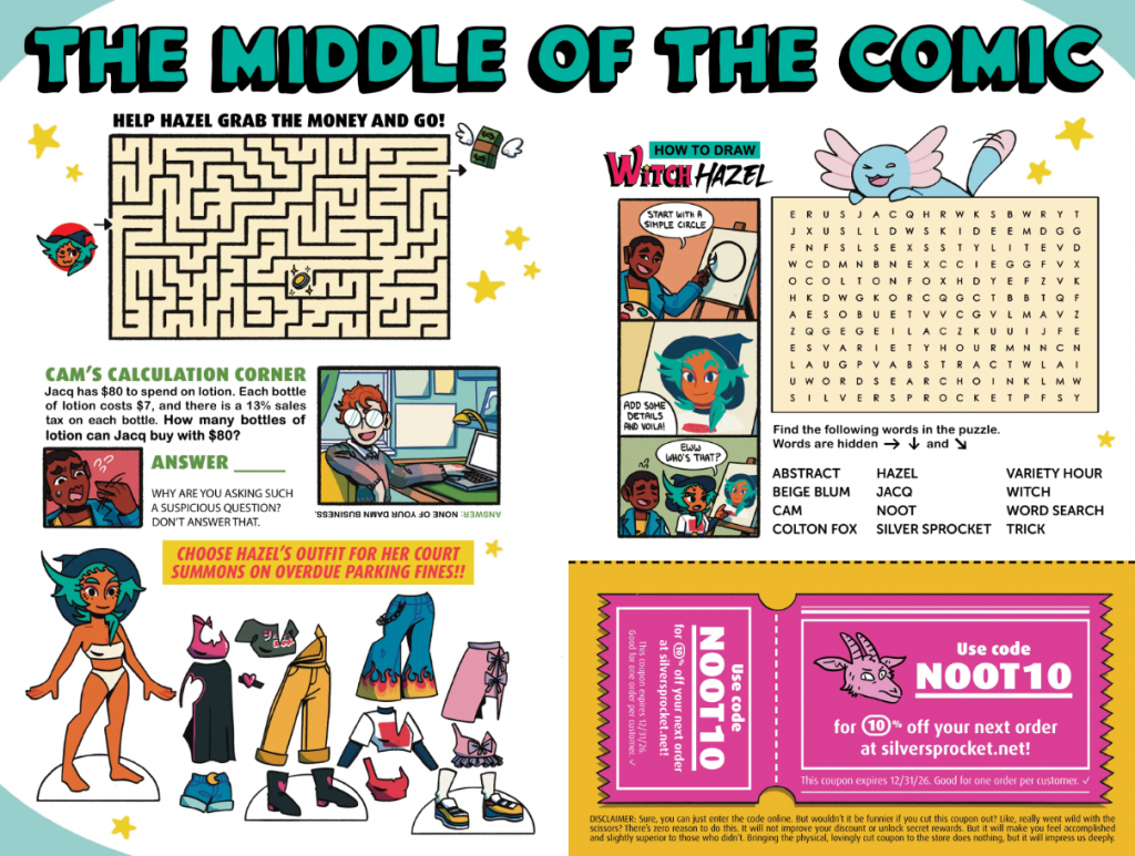 Spells fizzle, side gigs go sideways, and magical villains wreak havoc! For Hazel, it’s just another day as a witch-for-hire. Luckily, her friends, her crush, and her familiar Noot are there to pick up the pieces (or make things worse). Monsters, Magic, and Mayhem? Hazel’s definitely not getting paid enough for this! Contains 48 pages of comics, including three stories, one-page comics, fun activities, and an included sticker sheet!!