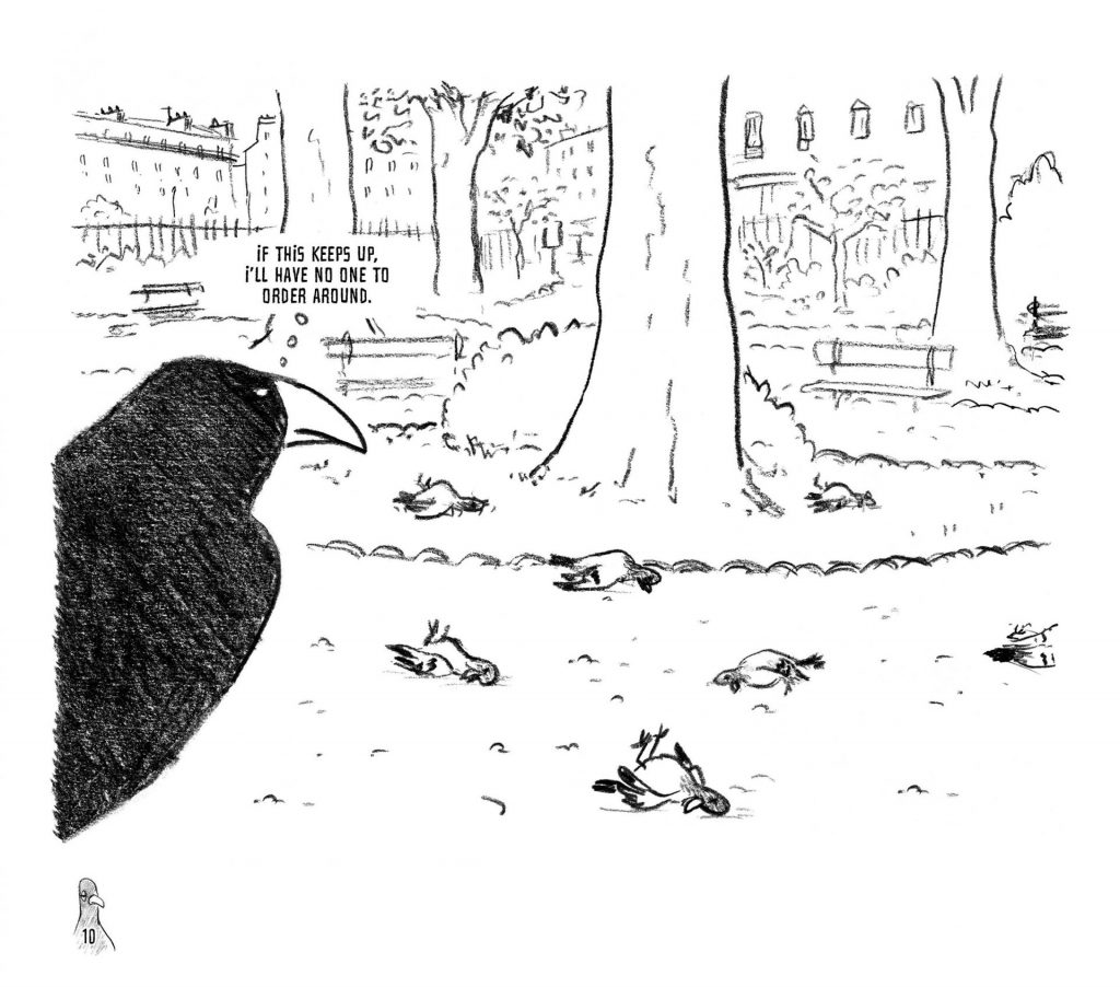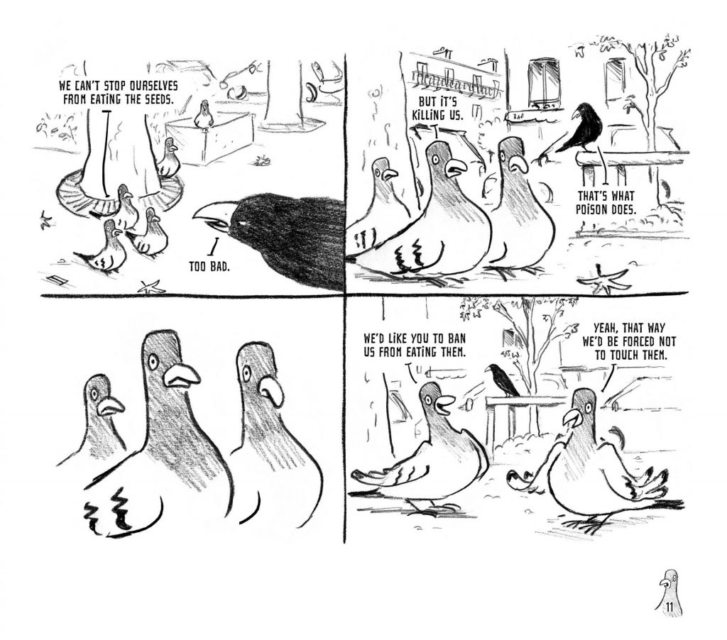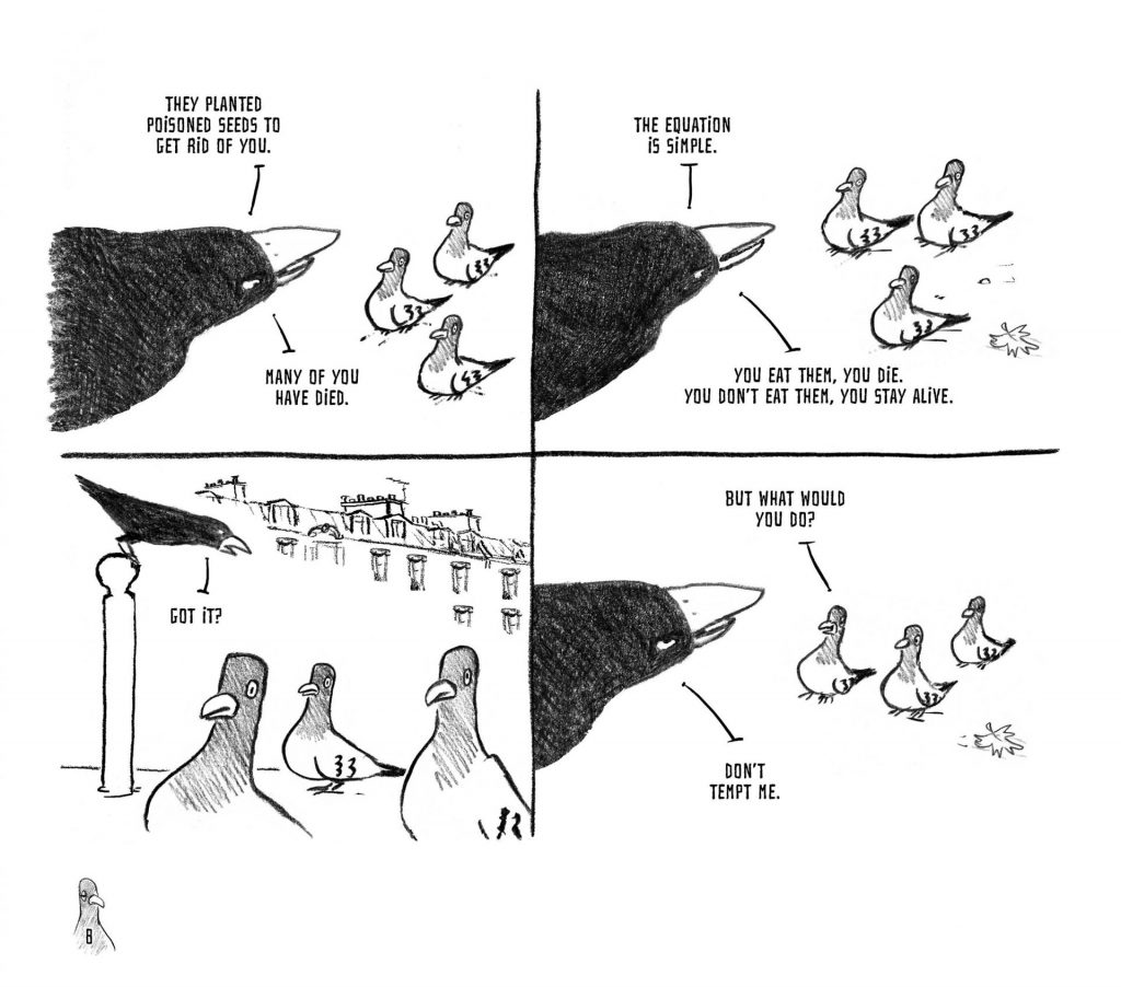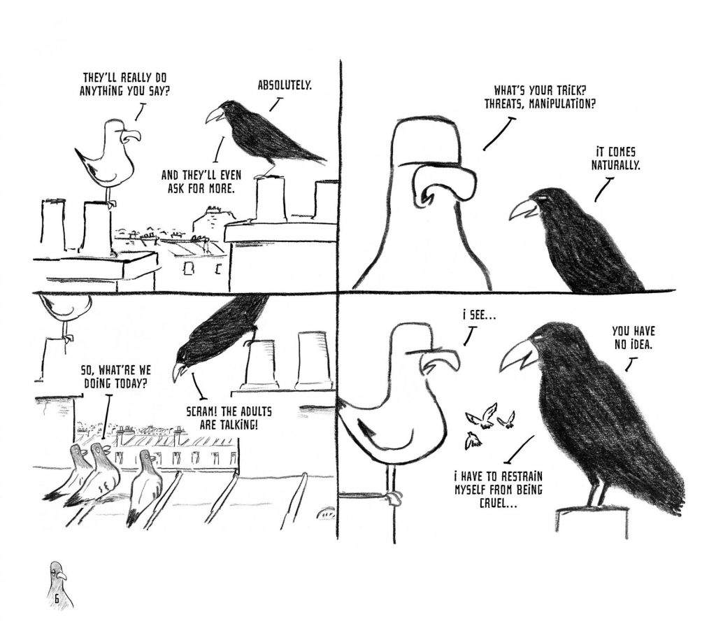 Life is simple for the pigeons. They have no desire to contemplate their future or take control of it. Free from responsibility, they are all too willing to submit to a strong authority. This is precisely what a cruel and power-hungry crow was waiting for—a perfect opportunity to wield his natural talents as a tyrant. The crow enforces law and order, but also terror and arbitrary rules. Everyone seems to accept this situation—or maybe, they are too scared to resist. Until an idealistic seagull steps in, determined to challenge the system through debate and free elections.