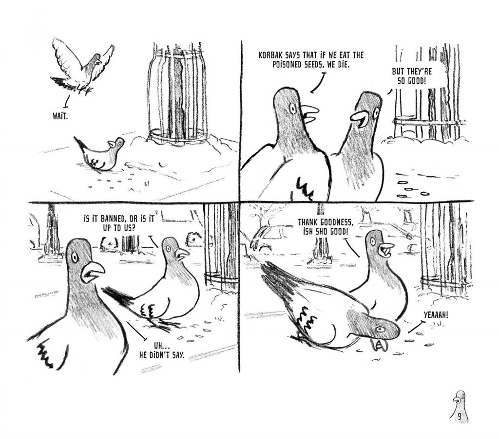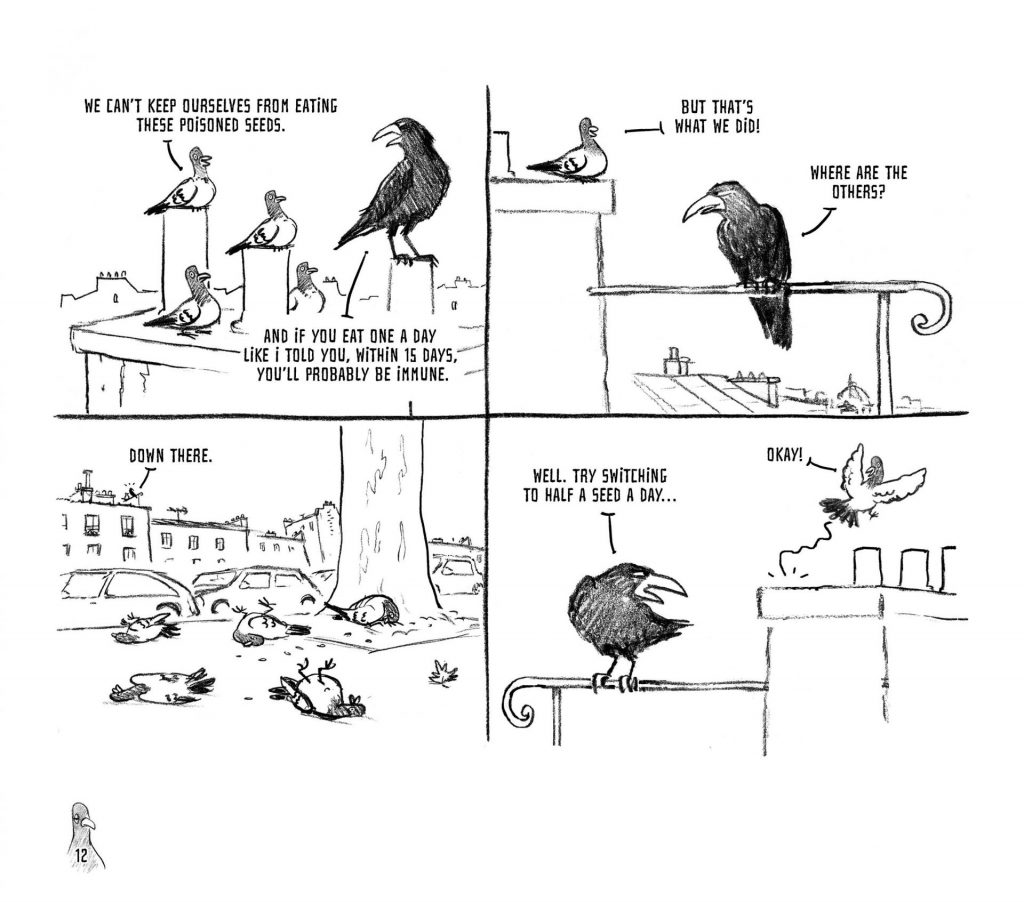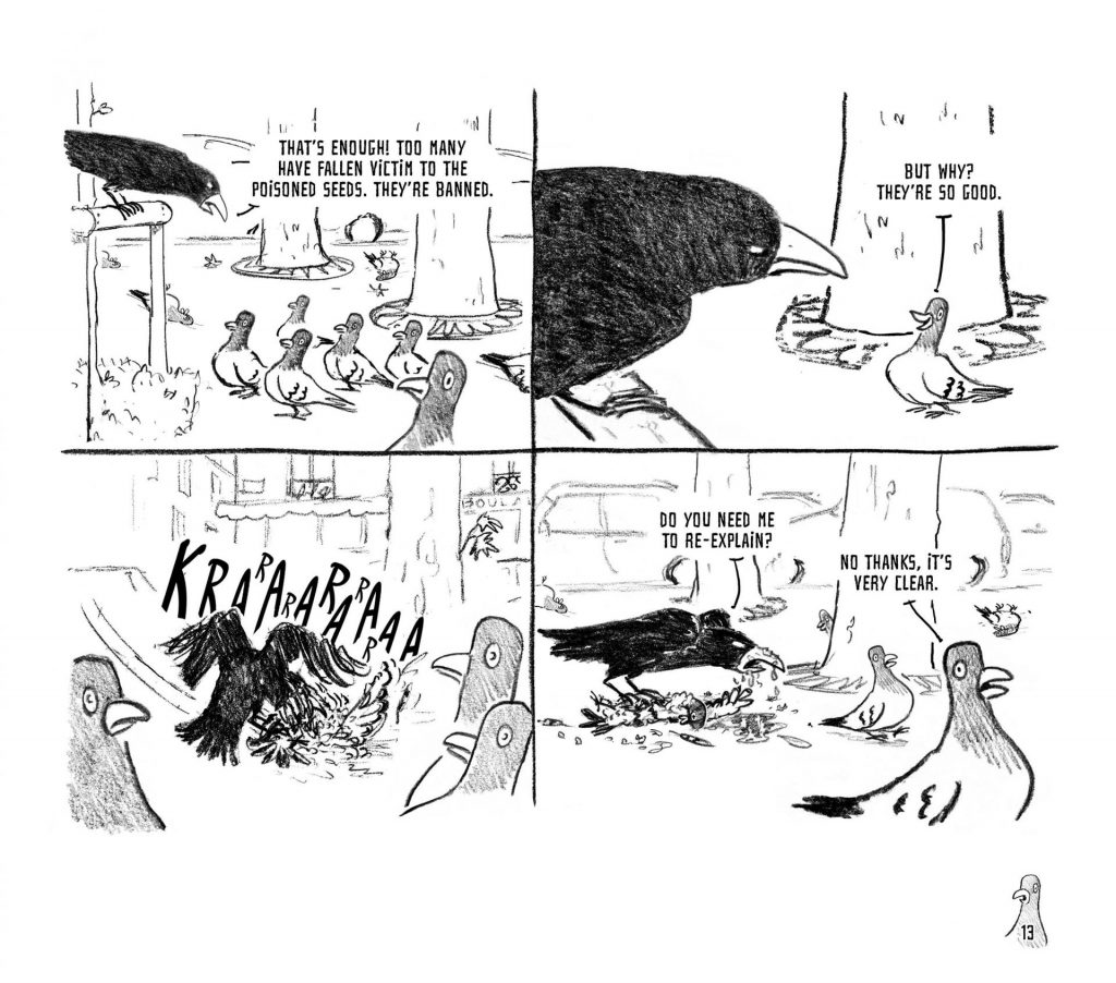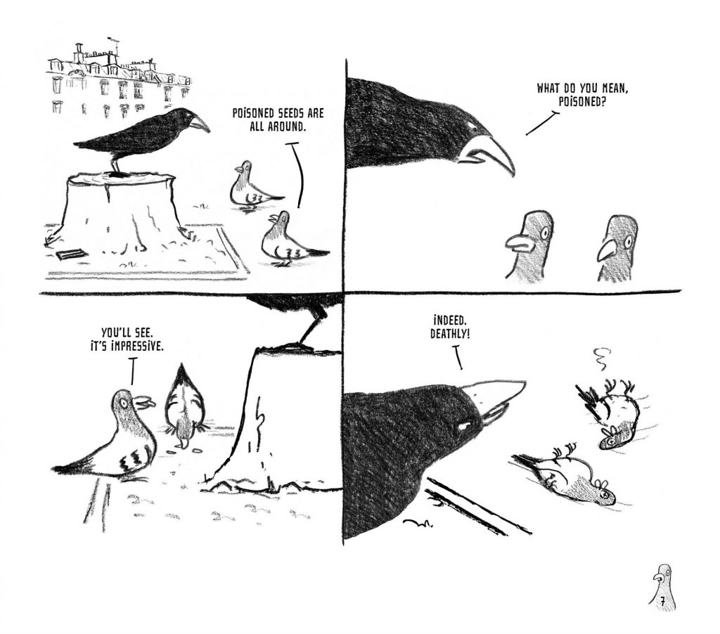 Life is simple for the pigeons. They have no desire to contemplate their future or take control of it. Free from responsibility, they are all too willing to submit to a strong authority. This is precisely what a cruel and power-hungry crow was waiting for—a perfect opportunity to wield his natural talents as a tyrant. The crow enforces law and order, but also terror and arbitrary rules. Everyone seems to accept this situation—or maybe, they are too scared to resist. Until an idealistic seagull steps in, determined to challenge the system through debate and free elections.