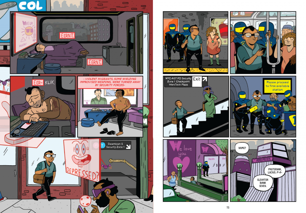 Mattie Lubchansky: There are smarter people than me to talk about this, but every time you write a book, you have to learn how to write a book. Every book is different and teaches you how to write it as you do it, and by the time you’re done with it, you’re like Oh great, now I know how to write a book and you go to write the next one, and you’re like I don’t know a goddamn thing. But this one was very much, yeah, I was doing all this research, I have an idea, and then I was like I think I want to do something about cults and communes and I was talking to a friend of mine who recommended a book about these communes in the 1900’s called Paradise Now, which I shouted out in the acknowledgements because it was very important to the research of this thing, and then. Once I had sort of like, I started reading this book, and for a long time, like months and months and months, I was just, you know, I like to apply the take a walk method where I’m just reading. I was just writing a lot of sentences. Is this idea a book? Does this go into the book? Is this a book style idea? And I started doing that for awhile, and after like six months of this, I had a 30 or 40 page Google Doc that was just sentences. Like most of it was gobbly gook. And then I gave that a month or two off, and I went and read it again, and I culled it down until I had, like, okay, here’s the five ideas I want the book to be about. And here’s a bunch of little details from all these societies that I was obsessed with, and New York history, and all this other stuff, and my personal experience with working in museums in a former life, and I was sort of like, okay, I got the meat of what I want to do. And then I do a lot of you know, comics are so labour intensive that, like, every step, I want to get it as edited as early as possible, just because I hate redrawing things, I would rather everything be really cut and dry before I’m inking. So I outline really, really heavily. The pitch for this book that I sent to my editor was like, you know, an outline chapter by chapter, down to individual conversations people were having, not the dialogue of the conversations, but so and so talks to so and so, and they determine that this thing happens. I had everything really really, really built out that way, and then it goes for me pacing is so important, well I have, this book is about 290 pages or something, and I want ten pages, I want this to take up ten pages, so okay I’ll break this down into ten pages and I’ll write the script that way. I script the whole thing, and then I pencil the whole thing, and then I color the whole thing.