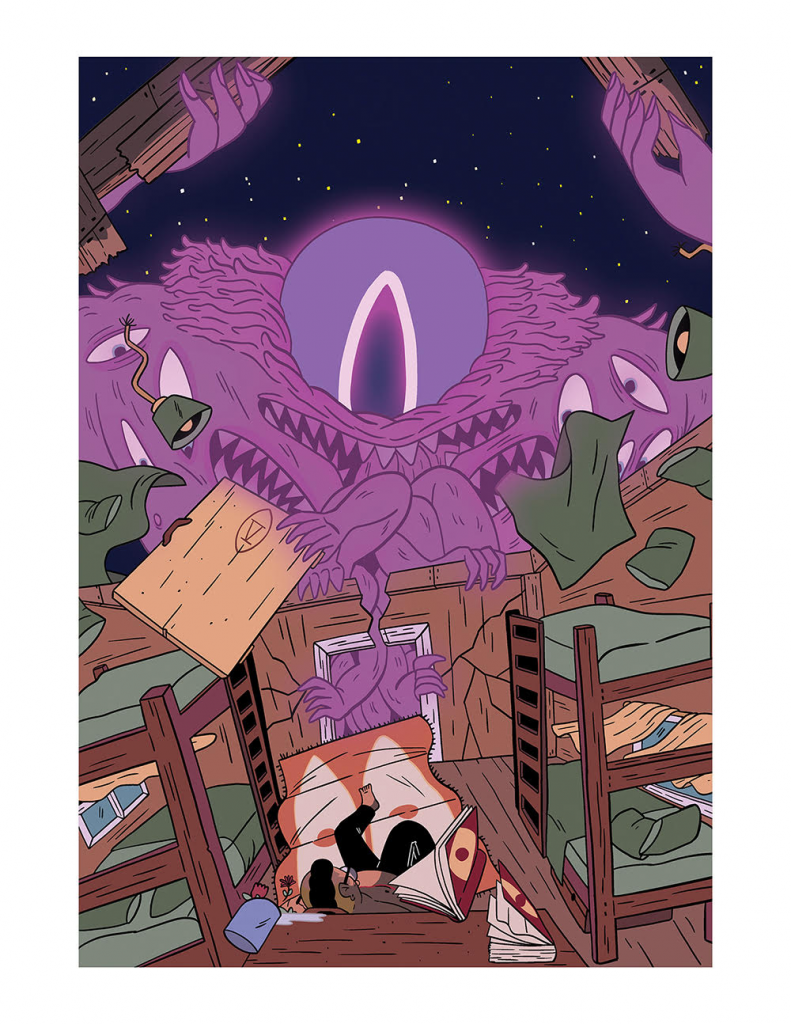 Mattie Lubchansky: Yeah. So the monsters that are in the visions, there’s one good one and one bad one. Sort of like to me, they were originally conceived of as the warring factions of Lucius’s brain and body. One of them is just this big sexy thing that he likes to have sex with and sort of like, this is like the freedom of joining up with this commune and being outside the city and he’s so buttoned up sexually in a way that is interesting because as a trans person, you do have to do so much interrogation of yourself, and you do have to be in touch with your body on some level, but then there’s this other hurdle that some of us face that now I have to like rank in with being in my body again, and it doesn’t solve every problem you have. So this freedom for him is sort of represented in this one creature. And then the other one is sort of like the doubt in the back of his head, like the fear and the shame, and he comes from this place that’s all surveillance, and it’s not a coincidence that it’s a big eyeball with mouths there to devour him living just under the surface of the thing that he wants and desires. And to me, there’s sort of like, I don’t have a definitive answer on whether or not they are real. Like you never see their effects in the real world, except one time you kind of do. And to me, that was sort of like, I think it was just sort of like this person sorting through their feelings in a way that in their waking life he can’t possibly come to terms with any of his own feelings, and this was just him cracking under some amount of pressure from himself.