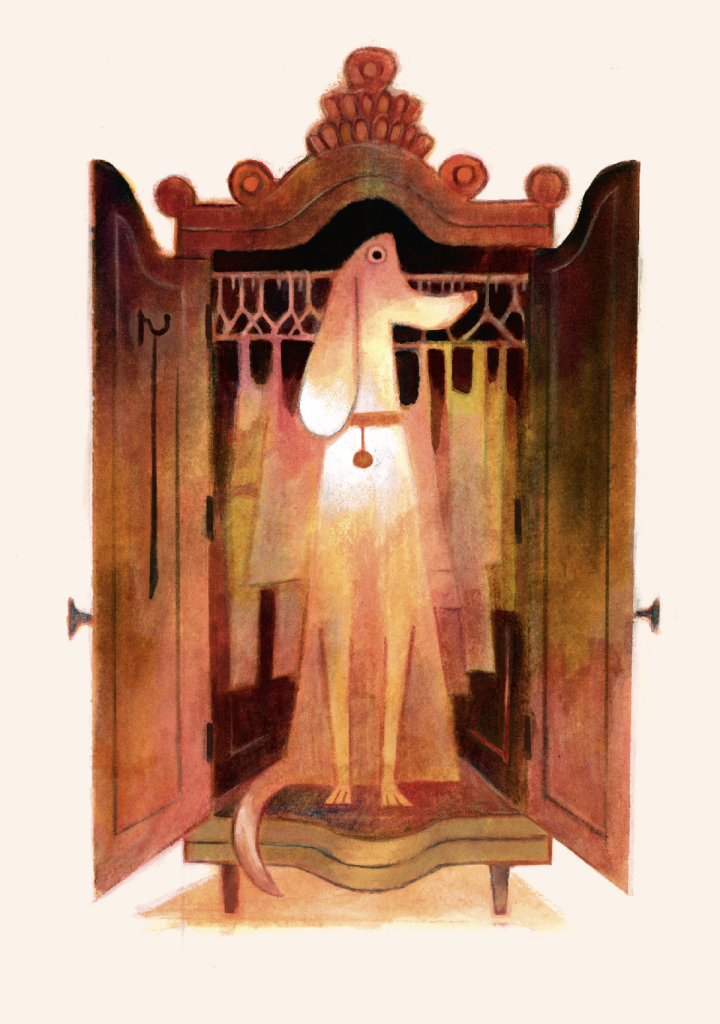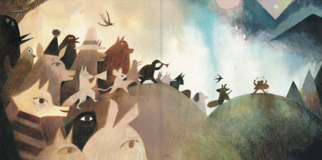 Distance between ideas, distance between image and text, between text and text, page and next page, layer of colour and another colour. These are all things I’m thinking about constantly. (…) He uses the example of ‘dog and wardrobe’, but in my books, it’s ‘frog and drum’, ‘girl and her shadow’. So when I work on these projects, I think all about these polarities.