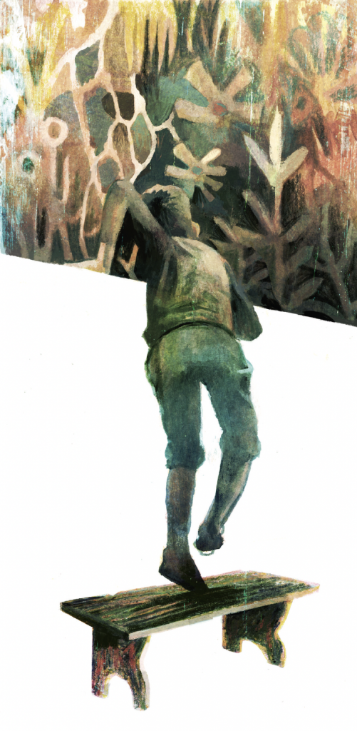 M: Yeah! It was a five-year journey. Claudia [Bedrick, editor for Enchanted Lion Books] and I had gone in different directions, where we’re like, “I’ll try and take one idea or one word from this chapter and follow that into a little dream image”. But other times, I was like, “you know what, I have this other painting, and I have 10 years of paintings that I could pull from (…), why don’t we put that image beside that image”? (…) And so, it did create this sometimes false distance, which made an interesting connection for the viewer.