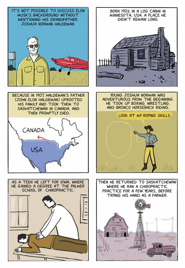 In one instance, Cunningham misses an opportunity to strengthen his case. In discussing Musk’s grandfather Haldeman’s involvement in Canadian politics, Cunningham mentions that Haldeman was vice president and provincial secretary of the Saskatchewan branch of the Social Credit Party. Cunningham describes the SoCreds as “a minor political party that promoted ideas of monetary reform.” He later reveals that Haldeman was “a pro-apartheid conspiracy theorist who blamed many of the world’s problems on Jewish financiers” and wrote a pamphlet expounding on those beliefs.