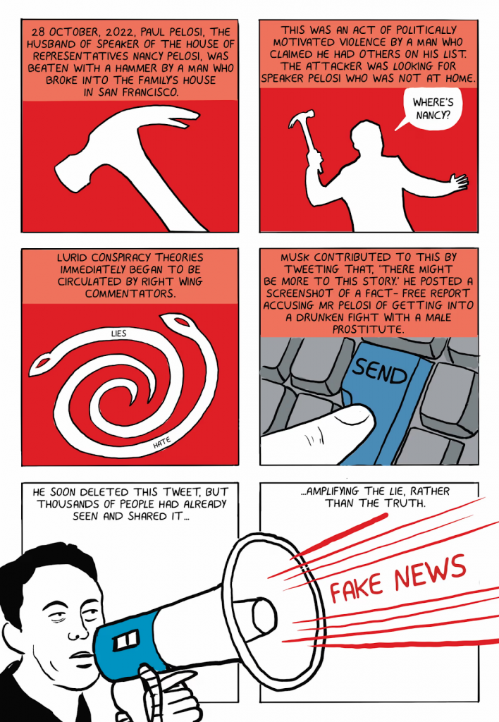 Whatever else may be said about it, Darryl Cunningham’s latest work shows an admirable degree of persistence. Originally published in French as Elon Musk: Investigation into a New Master of the World, the comic struggled for a year to find a possible English publisher over what Cunningham alleged was “concern over possible legal consequences.” He blamed “a climate of fear” for publishers’ lack of bravery. Oddly, Cunningham’s Putin’s Russia: The Rise of a Dictator encountered no such cowardice, even though its subject has allegedly murdered his overseas critics, something Musk has yet to attempt.  It was up to Seven Stories Press to prove that the land of the free and home of the brave had not again become the “land of the belly-crawler and the home of the fearful” that I.F. Stone wrote about in the 1950s.