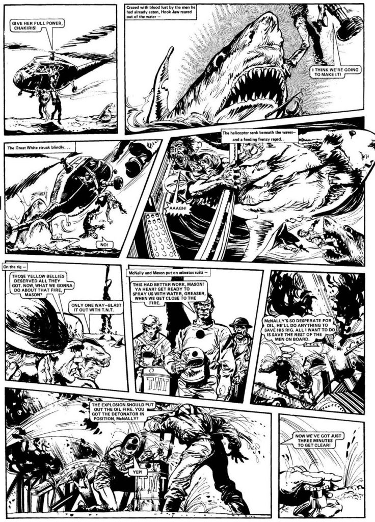 Yet there is more to Action than bloodshed bolted on top of generic British stories. Hook Jaw, for example, has that genuine Mills’ misanthropy – the reader cheers for the shark, as ninety-nine percent of the humans in the story are filthy industrialists who will sell their mother for a dollar. It’s a story about greed, capitalism run amok, and environmental destruction – all told in three-page chunks (and with a lot of human chunks). The John Wagner-scripted Blackjack, a boxing strip with a great hook (our hero is slowly losing his sight and must reach the championship before going completely blind), had a genuine desperation built into it. Every strip brought the hero closer to the inevitable end of his career. Even as he won one battle after another, the end was just around the corner.
