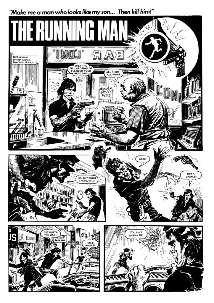 Likewise, the frantic Running Man with a British hero framed for murder in the USA and ending up on the run from both police and the people who framed him, a Hitchcockian story of alienation told with the explosive energy of a 1970s exploitation movie. Like many British comics of the period it ends as unintended commentary on the USA which becomes a commentary on the UK: in painting a picture of America as a sprawling land of endless violent encounters, everyone is armed and every spot is a protentional death trap, the creators paint a picture of a panicked former Empire looking with eyes wide open at is replacement: ‘This is the new global hegemon?!’ they seem to ask.